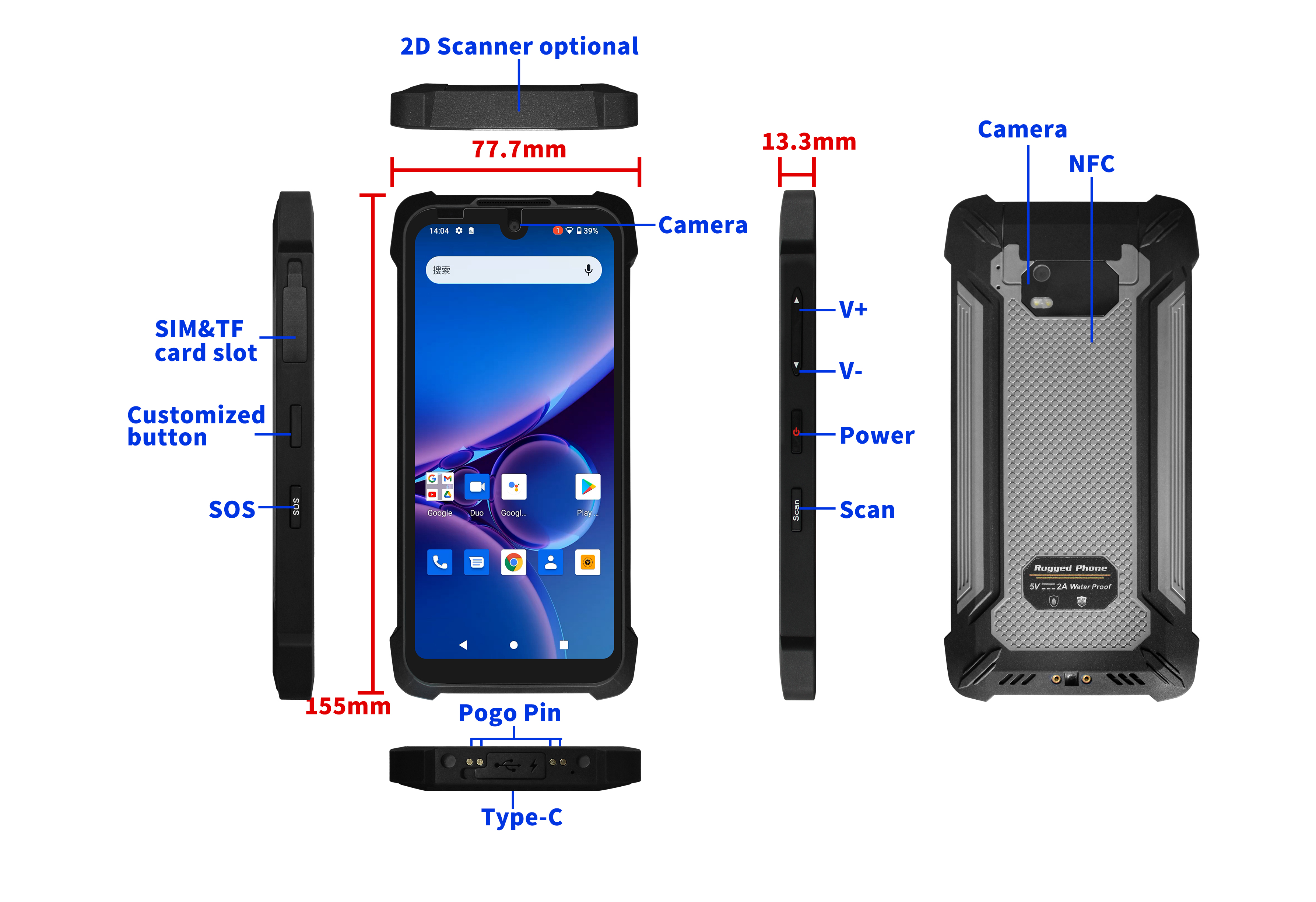 The SM5 is a 5.7-inch rugged handheld terminal running Android 11.0, powered by MTK MT6765 octa-core processor (2.3GHz, 4x Cortex-A53 @1.8GHz + 4x Cortex-A53 @2.3GHz) with IMG PowerVR GE8320 GPU. It features scalable storage (4GB/64GB, 6GB/128GB optional), 5.7-inch 720×1520 display (450nits), 5MP front/13MP rear cameras with flash, 4000mAh 3.8V battery (14-hour video playback), 4G LTE global connectivity, and dual microphones with noise reduction. With IP68 dust/waterproof, 1.5m drop resistance, 8-in-1 sensor suite, and compact design (155×77.7×13.3mm/240g), it's optimized for long-endurance Android mobile data collection in harsh environments.