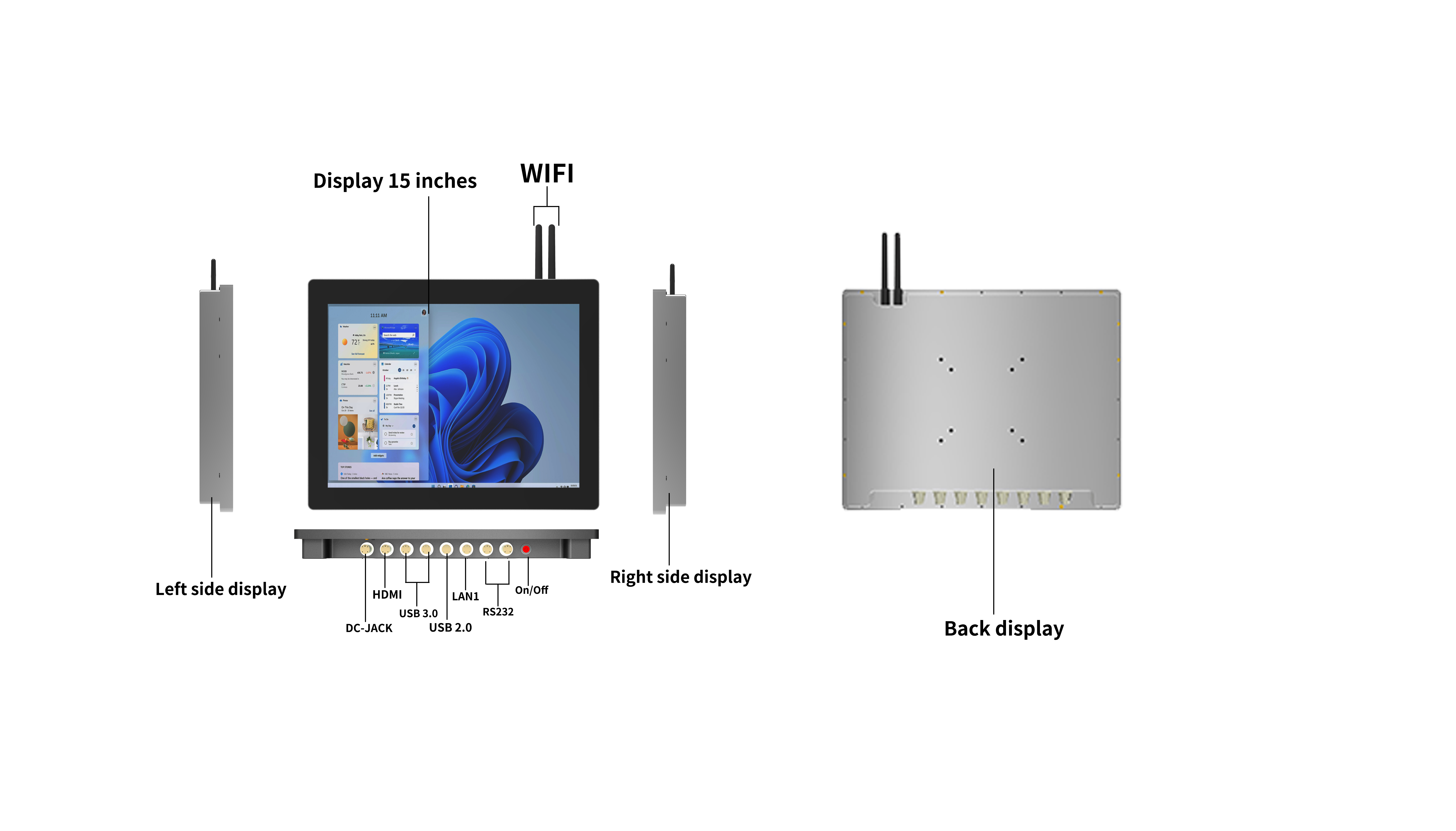 Practical multi-system waterproof industrial PC: Multiple CPUs (incl. domestic), 15-inch HD screen, stable WiFi/Bluetooth. IP65 waterproof + wide temp resilience (handles logistics/industrial scenes). 12V power + optional speakers — reliable for cross-industry operation.