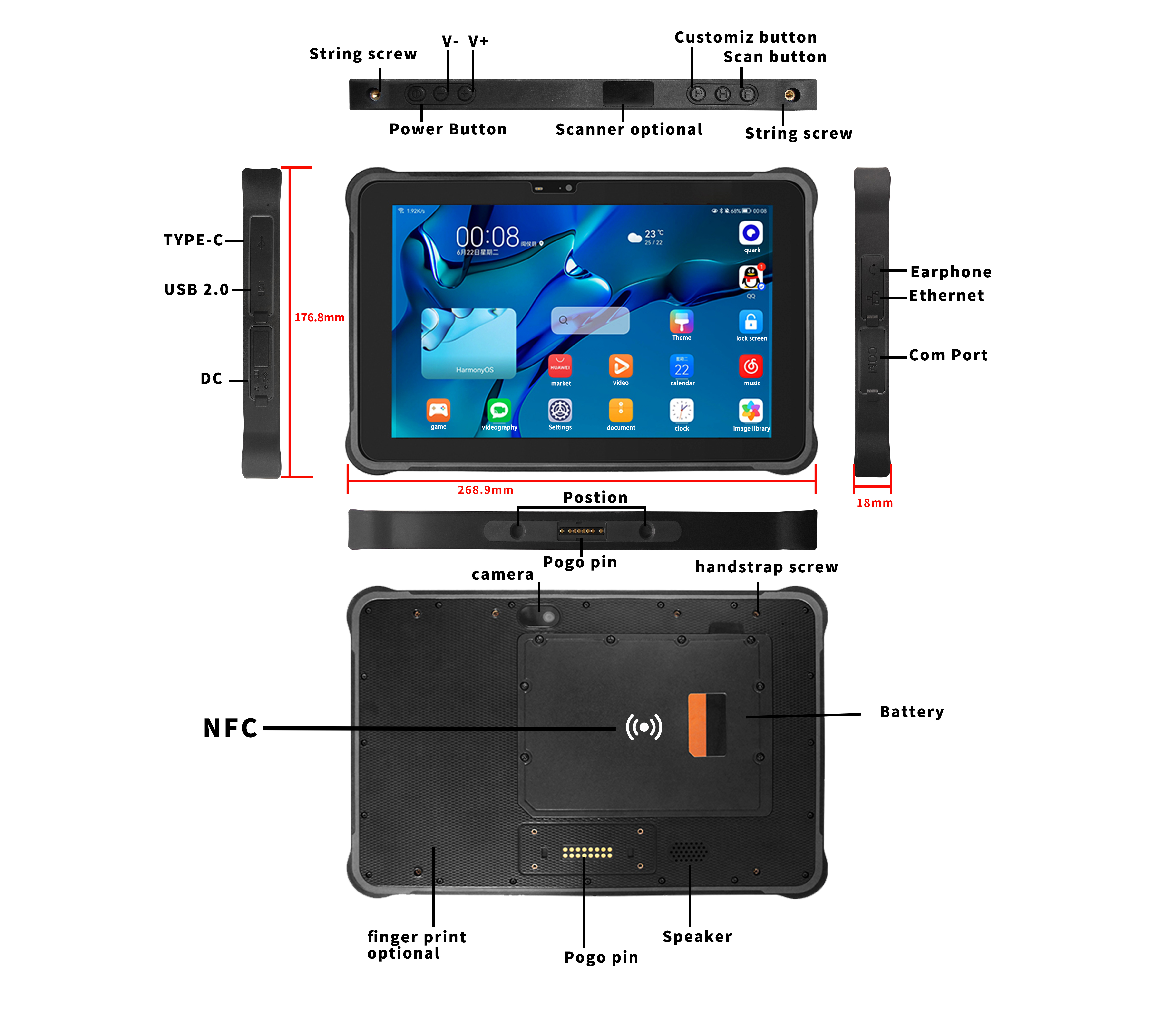 | Interface In/Out Port | Type-C *1 (OTG); SIM Card Slot*1; TF Card Slot*1; Earphone*1; DC*1 (3.5×12mm); USB 2.0 *1; RJ45*1; RS232*1 Bottom pogopin: USB 2.0; Charging; RS232 Back pogopin: USB 2.0; RS232 EDP interface: Reserved interface |