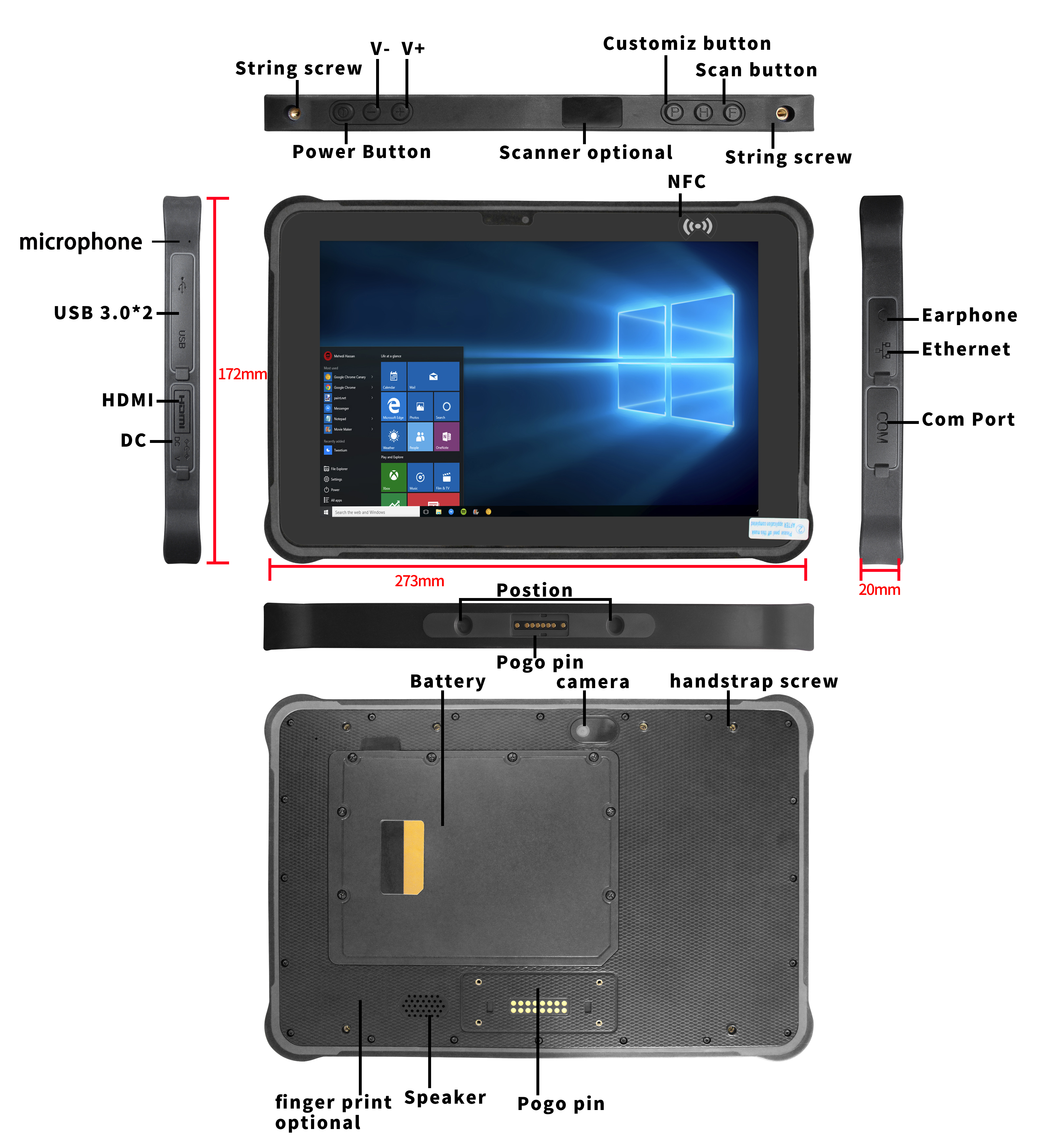 | Interface In/Out Port | HDMI*1; SIM Card Slot*1; TF Card Slot*1 (Customized items); Earphone*1; DC*1 (4.0×15mm); USB 3.0 *2; RJ45*1; RS232*1 Bottom pogopin: USB 2.0; Charging; RS232 Back pogopin: USB 2.0; RS232 |