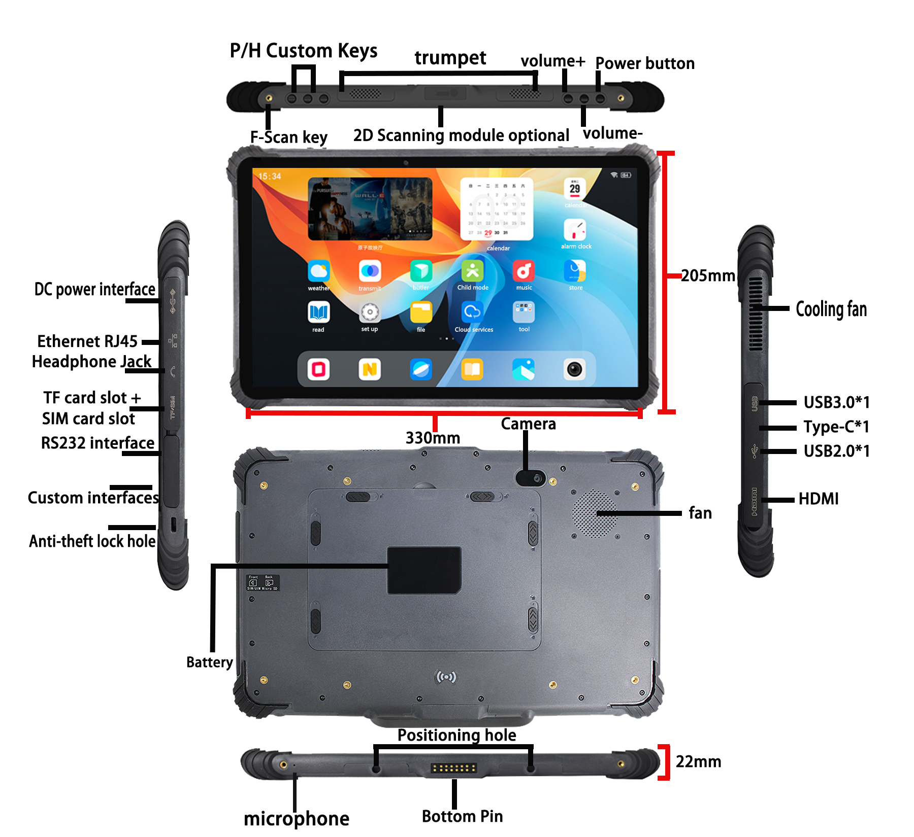 | Interface In/Out Port | HDMI Type A*1; USB-A (USB 2.0 *1+USB 3.0 *1); Type-c*1; Anti-theft lock hole; Aviation interface x2 (customized & RS232, RS232 only TX RX GND); Card slot (SIM+TF); Headphone Jack (∮3.5mm); Ethernet RJ45 (10/100/1000M); DC power interface (∮4.0mm) Bottom pogopin: USB 2.0; Charging; RS232 |