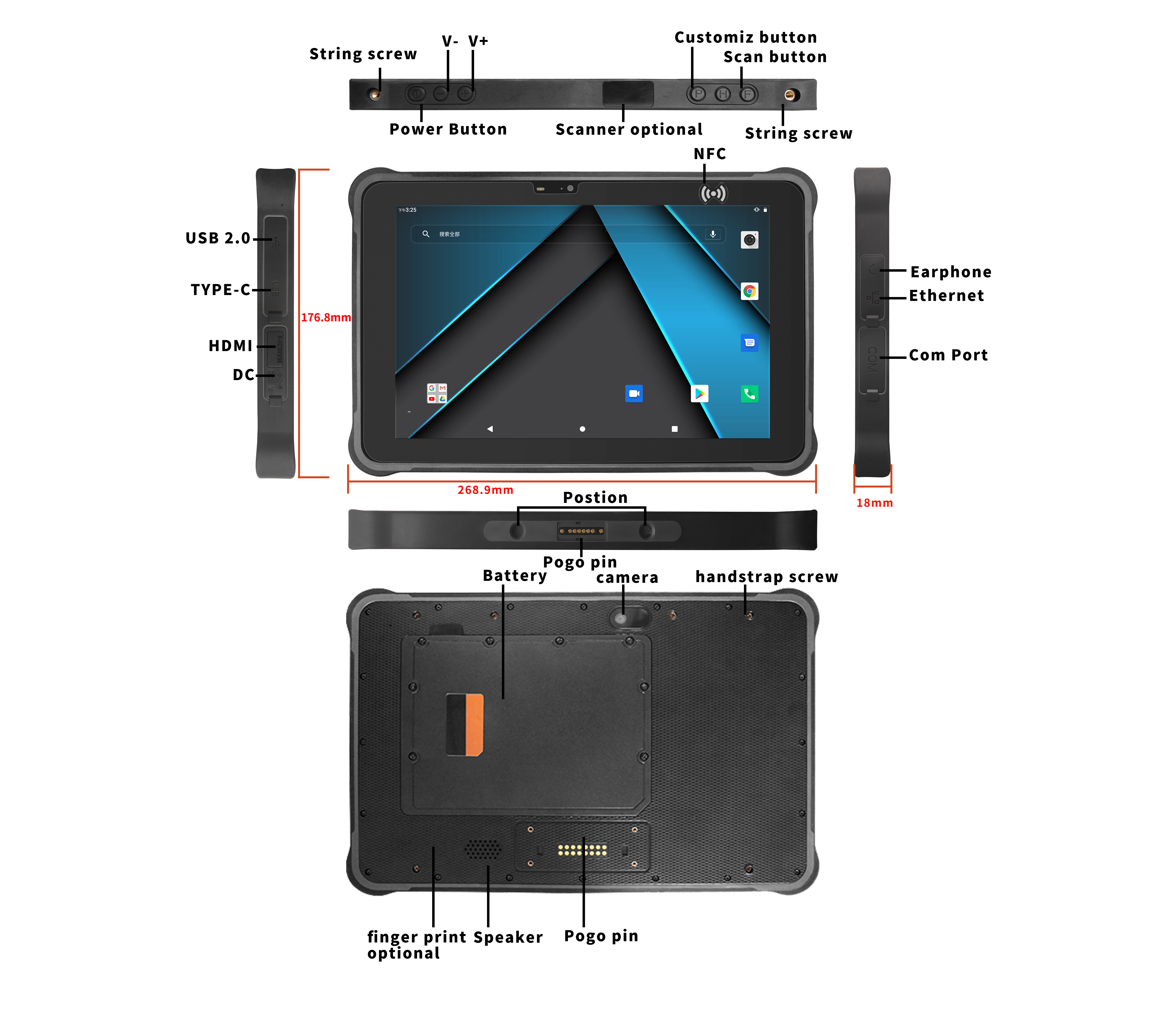| Interface In/Out Port | Type-C *1 (OTG), SIM Card Slot*1, TF Card Slot*1, Earphone*1, DC*1 (3.5*12mm), USB 2.0 *1, RJ45*1, RS232*1, HDMI*1 (Only 8+256 version) Bottom pogopin: USB 2.0; Charging; RS232 Back pogopin: USB 2.0; RS232 |
