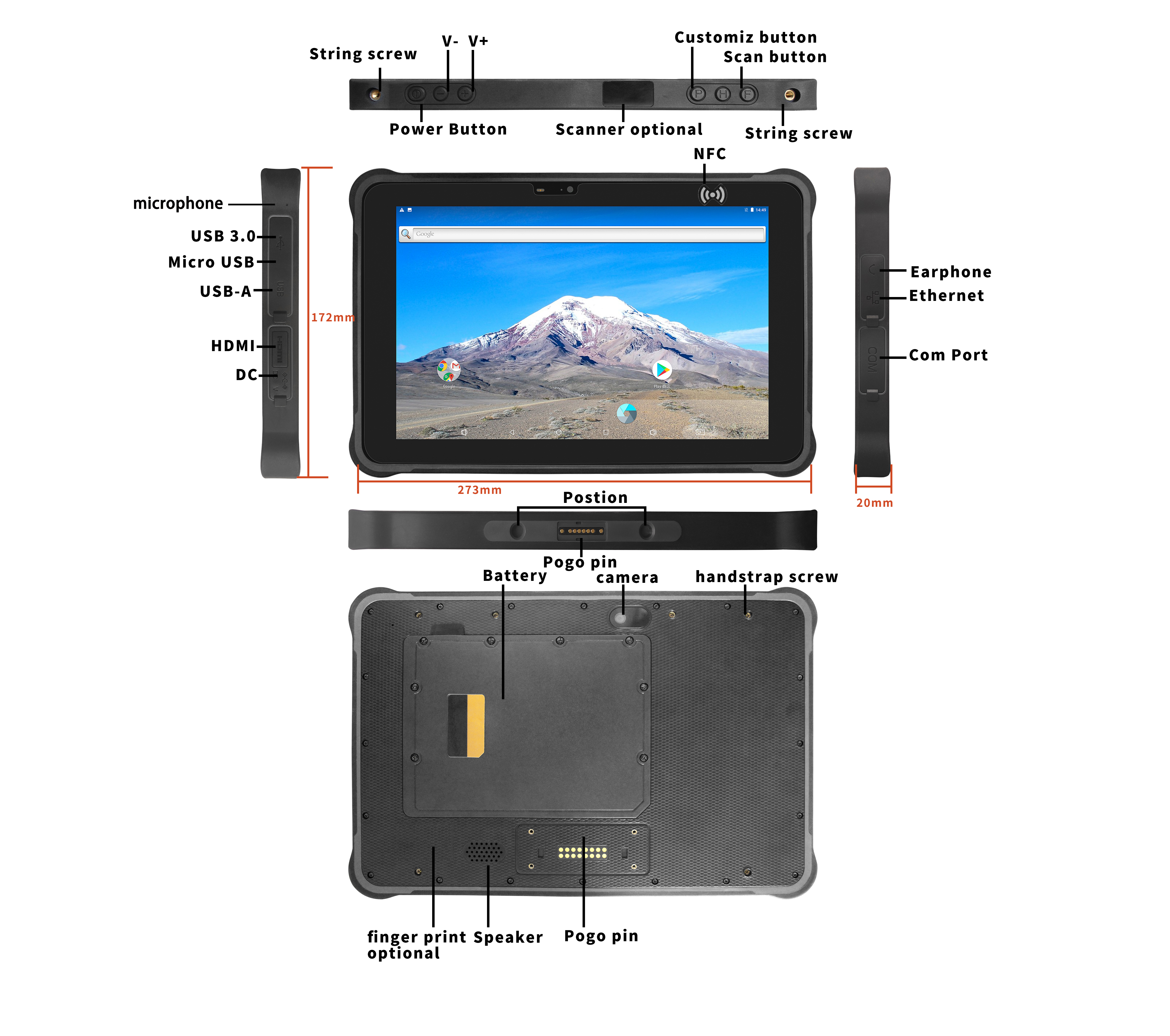 | Interface In/Out Port | Micro USB *1; SIM Card Slot*1; TF Card Slot*1; Earphone*1; DC*1 (3.5×12mm); USB 2.0 *1; RJ45*1; RS232*1; USB 3.0 *1; HDMI*1 Bottom pogopin: USB 2.0; Charging; RS232 Back pogopin: USB 2.0; RS232 |