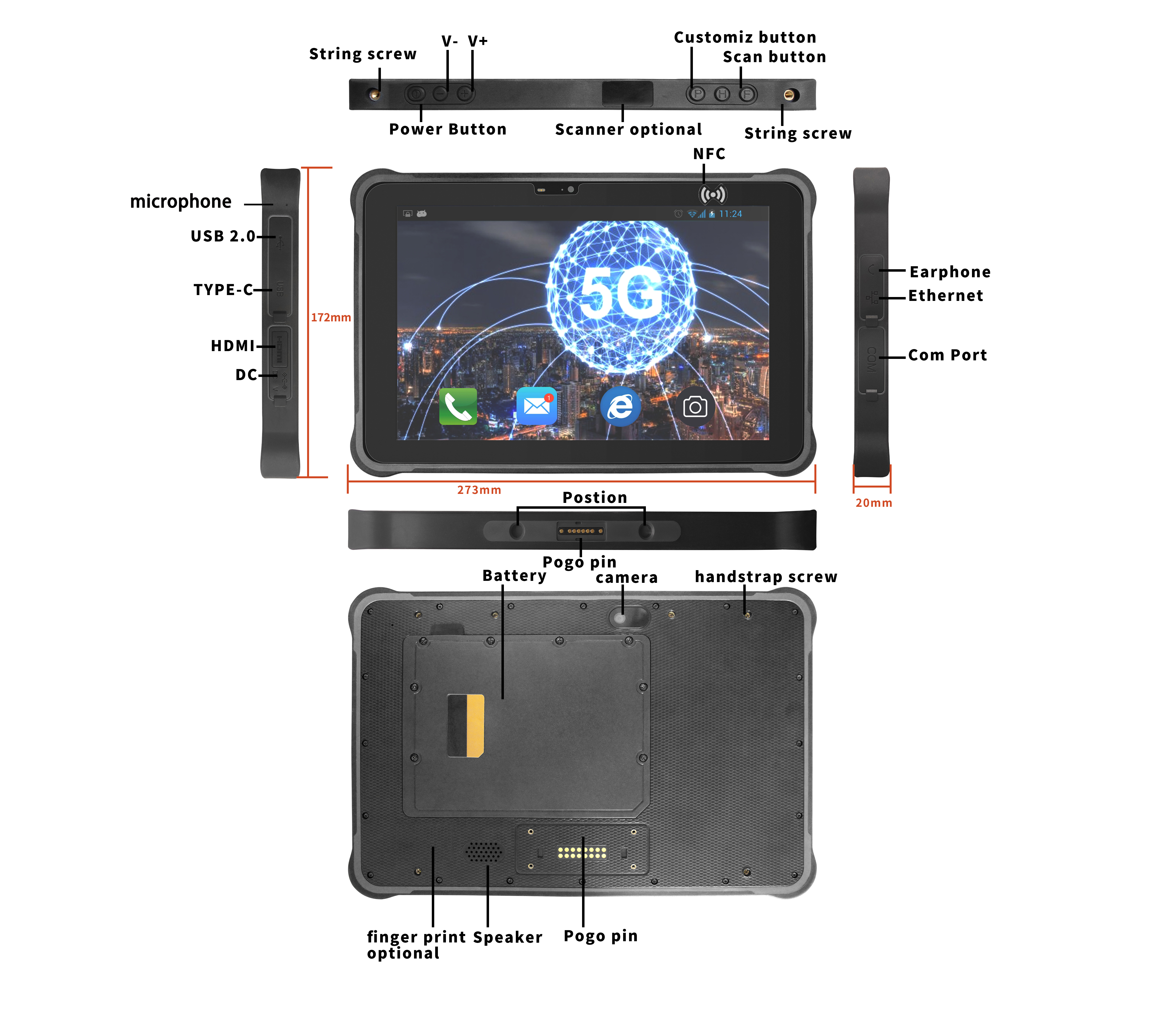 | Interface In/Out Port | Type-C *1 (OTG); SIM Card Slot*1; TF Card Slot*1; Earphone*1; DC*1 (3.5×12mm); USB 2.0 *1; RJ45*1; RS232*1 Bottom pogopin: USB 2.0; Charging; RS232 Back pogopin: USB 2.0; RS232 |