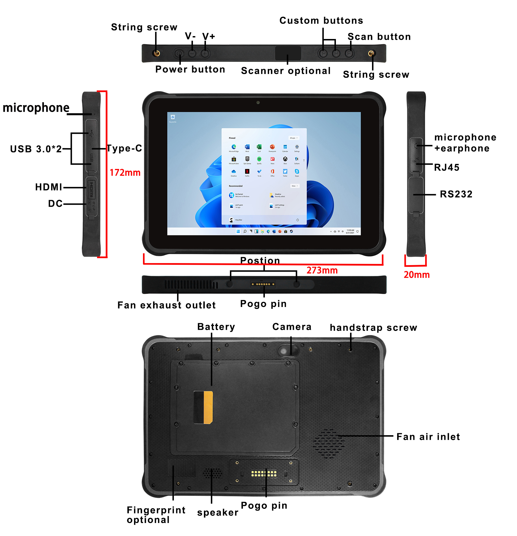 | Interface In/Out Port | DC*1 (4.0×15mm); HDMI Type A x1; USB Type_A: USB3.2 Gen1 x2; USB Type_C: USB3.2 Gen1 x1 (PD/DP/Data/Charging); Earphone: ∮3.5mm x1; RJ45 (Gigabit); RS232 (DB9) Bottom pogopin: USB 2.0; Charging; RS232 Back pogopin: USB 2.0; RS232 |