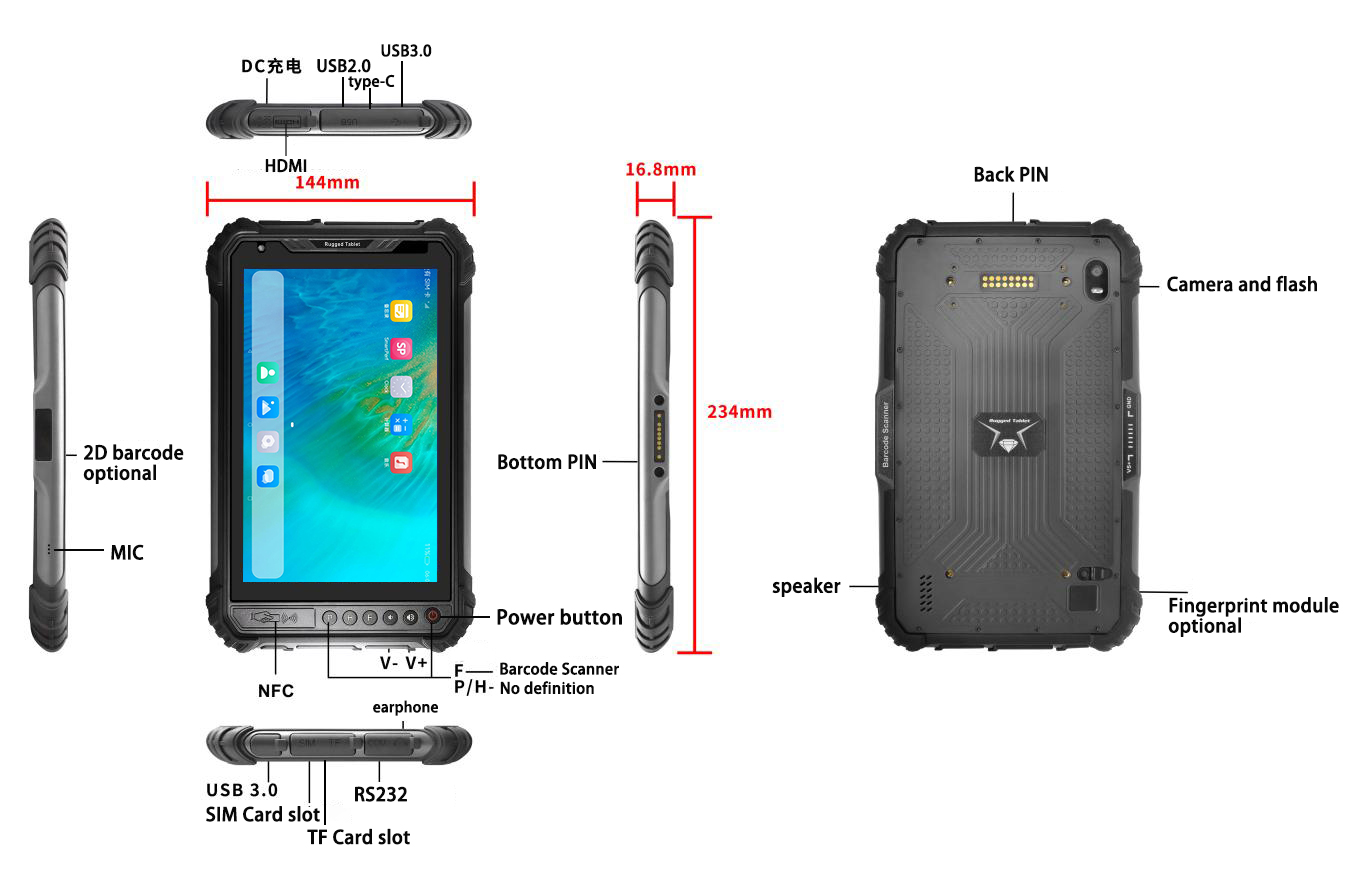 | Interface In/Out Port | Type-C *1 (OTG/fast charging), SIM Card Slot*1, TF Card Slot*1, Earphone*1, DC*1 (4.0*15mm), USB 2.0 *1, USB 3.0 *2, RS232*1(mini-USB), HDMI*1 Bottom pogopin: USB 2.0; Charging; RS232 Back pogopin: USB 2.0; RS232 |