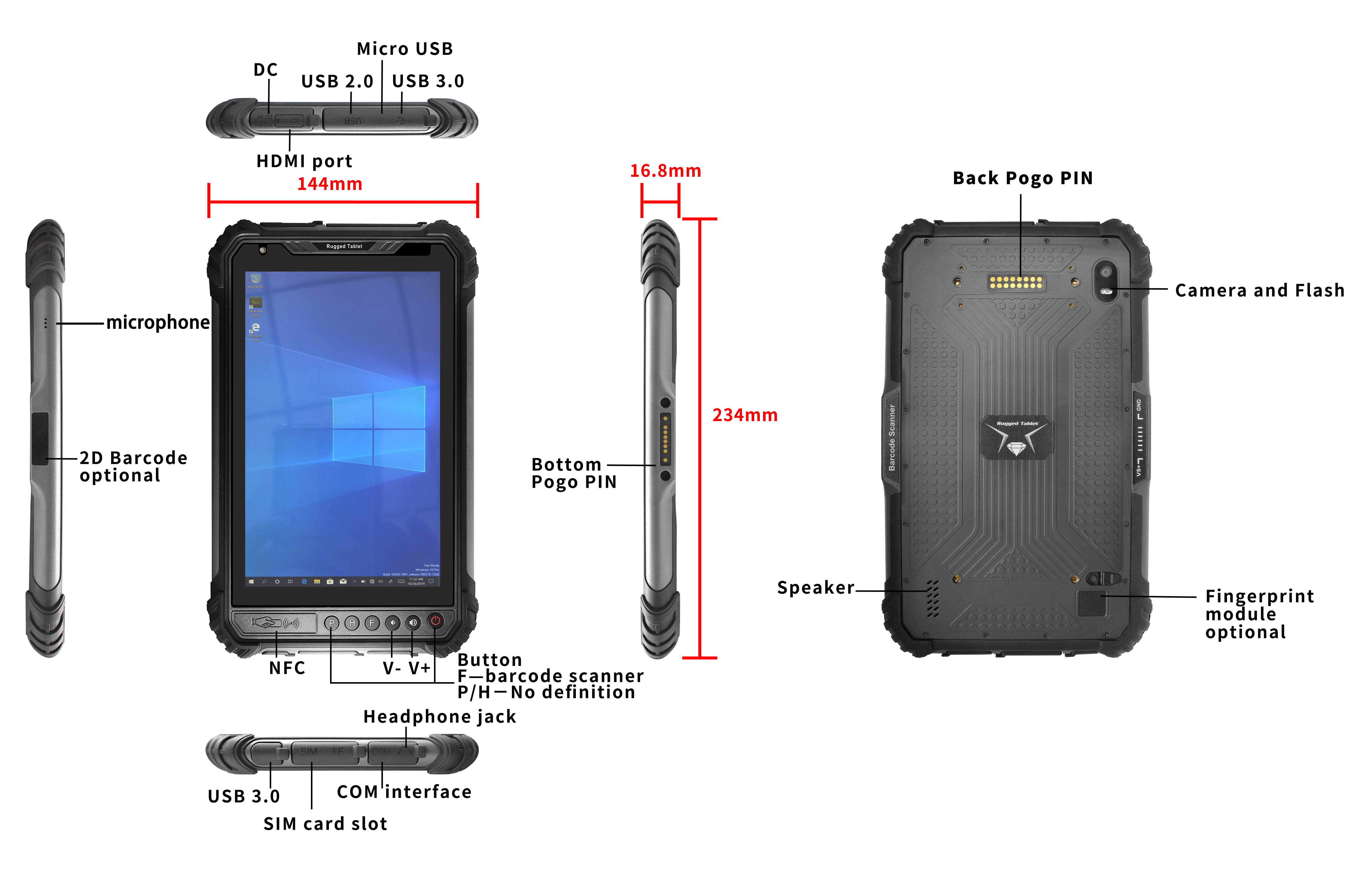 Rugged tablet suitable for logistics, industrial, and other scenarios: equipped with Windows 10 and a quad-core processor, features a high-brightness screen, supports multi-mode communication, and comes with practical functions; offers IP65 protection and wide temperature adaptability, with expandable features, making it a durable tool for industrial environments.