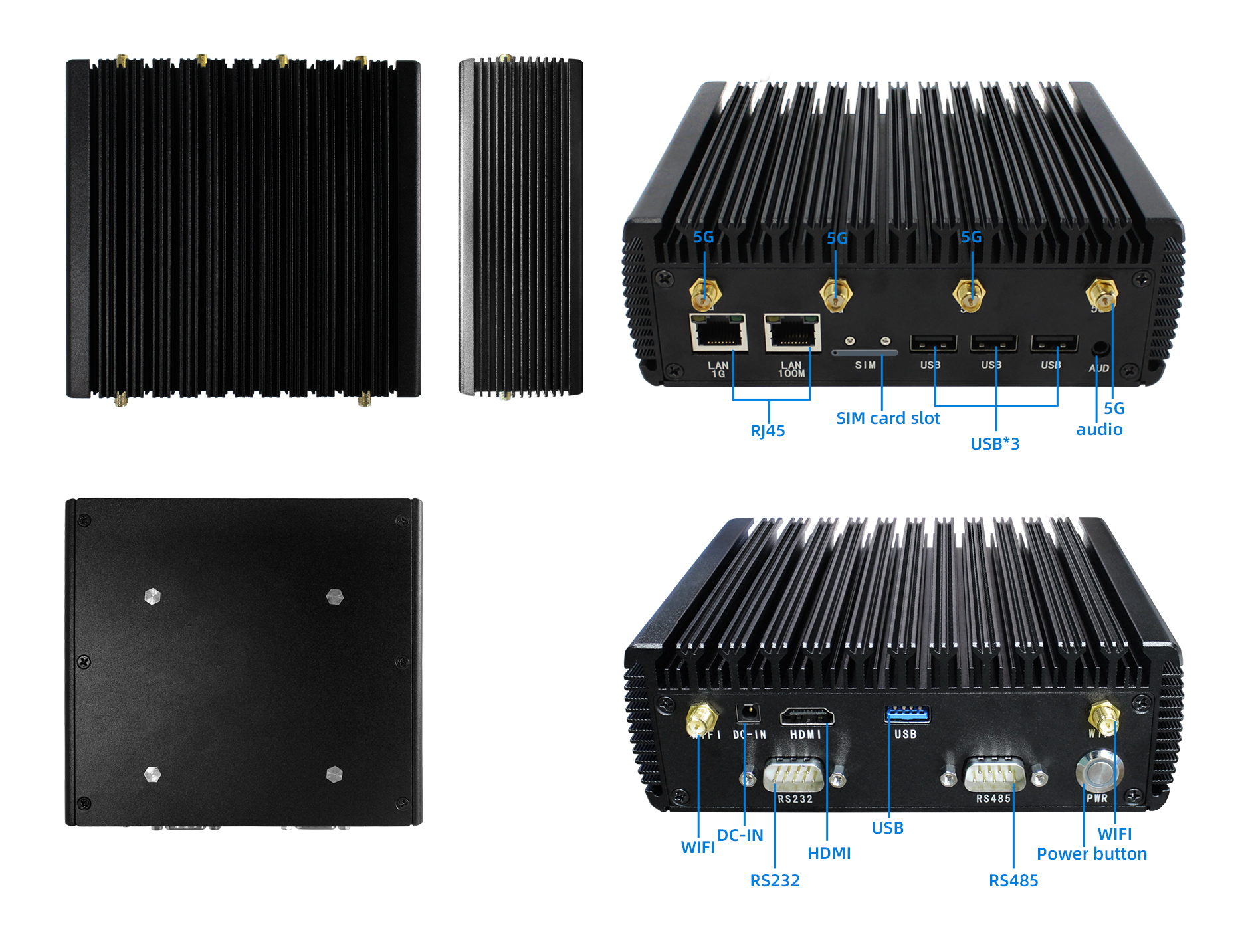 | Interface | 1. DC 12V 3A ∮4.0mm 2. HDMI Type A x1, Audio and video output 3. USB Type_A:USB3.0 x1 4. USB Type_A:USB2.0 x3 5. Earphone:∮3.5mm headphone jack x1 6. RJ45(FE):Supports Fast Ethernet 7. RJ45(GE):Support Gigabit Ethernet 8. RS232:Standard DB9 9. RS485:Standard DB9 10. SIM card slot: dual card single standby 11. 5G antenna interface x4 12. WiFi antenna interface x2 |