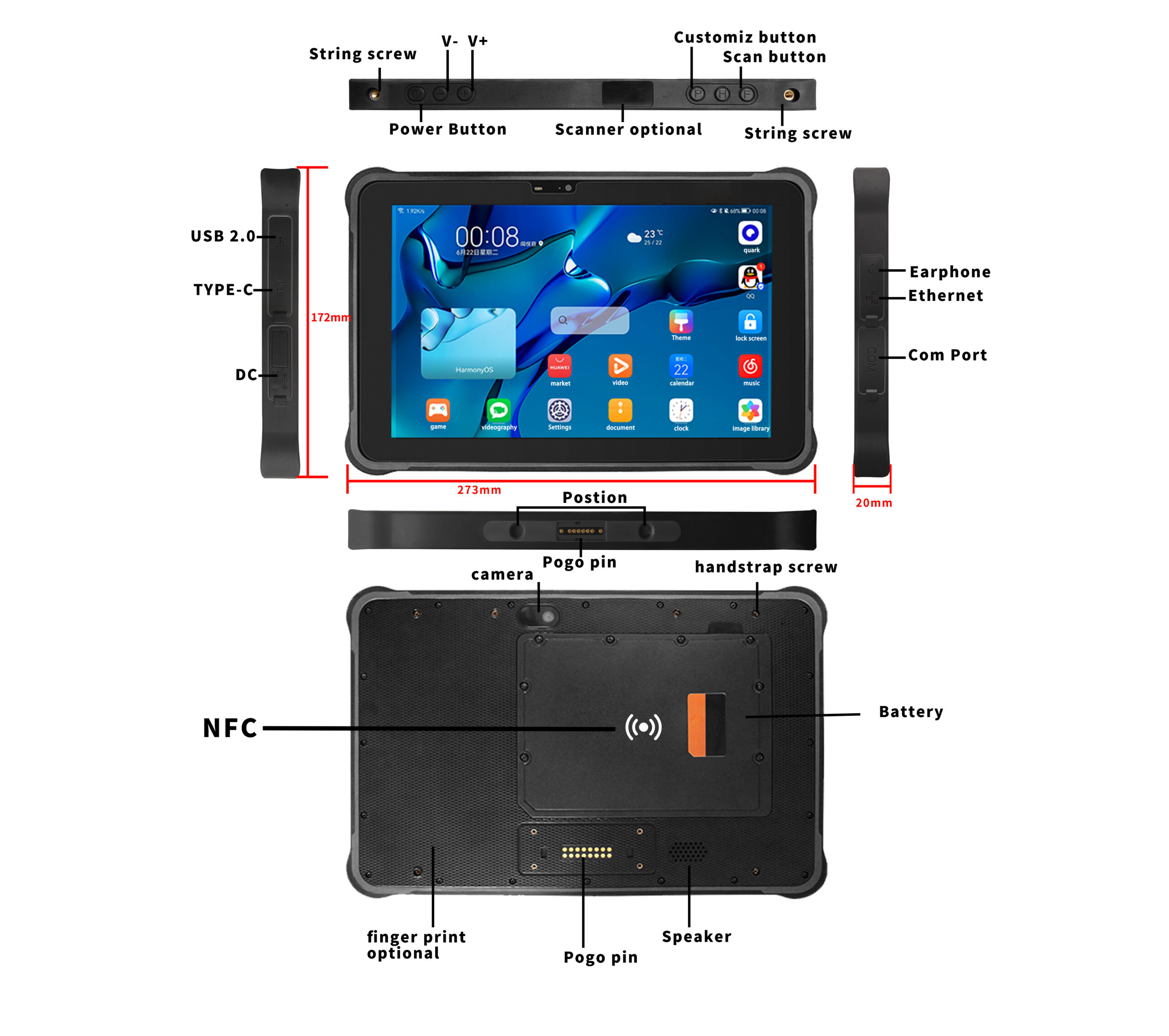 1. Type-C *1; OTG 2. SIM Card Slot*1 3. TF Card Slot*1 4. Earphone*1 5. DC*1; 3.5*12mm 6. USB 2.0 *1 7. RJ45*1 8. RS232*1 |